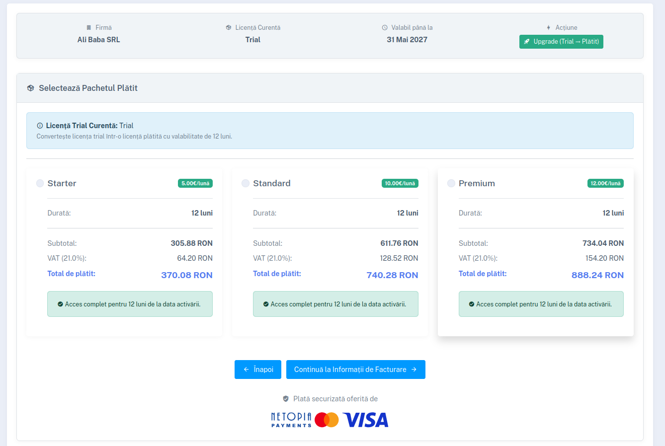 Licenta este asociată unei singure firme. Fiecare firmă va avea propria licență si e este afișată in bara de meniu: