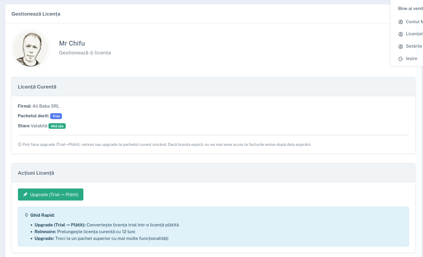 Informații despre licența curentă se pot obține din Setări (Click pe numele de utilizator in colțul dreapta sus):